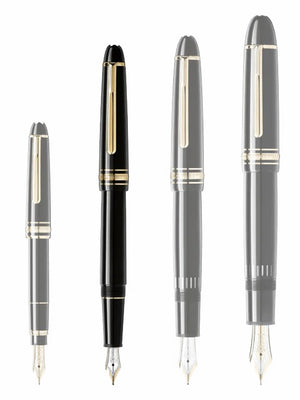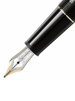 The Meisterstück Gold-Coated Classique Fountain Pen evolves into Montblanc’s design icon. Cap and barrel are crafted in black precious resin inlaid with a white Montblanc emblem. Three gold-coated rings with embossed Montblanc lettering and a gold-coated clip with individual serial number emphasize the timeless design of the Meisterstück Classique Fountain Pen. This gold-coated fountain pen is designed with a piston converter, allowing for optional use of ink cartridges, and a handcrafted Au 585 / 14K gold nib with rhodium-coated inlay. To express your personality, Montblanc offers a gratuitous engraving of names or initials.