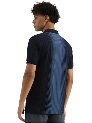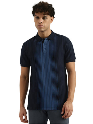 Classic navy striped polo for men. Short sleeves, polo neck, and button closure. Crafted from comfortable polycotton blend for a relaxed fit. Perfect for casual outings and everyday wear.