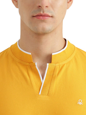 Celebrate your suave with this solid black t-shirt. Complete with branding on its chest, this T-shirt comes in a regular fit and has short sleeves with a baseball collar that opens into a v neckline. The contrast tipping on the collar, placket and sleeves add a stylish dimension to the garment. Pair with jeans and sneakers to keep it casual.