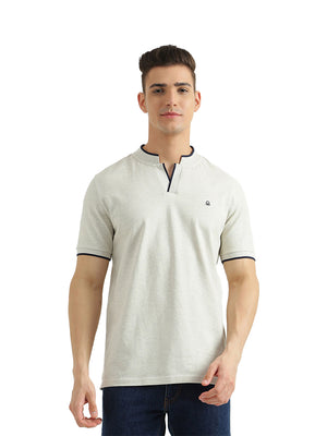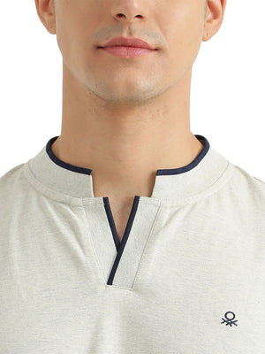 Celebrate your suave with this oatmeal t-shirt. Complete with branding on its chest, this T-shirt comes in a regular fit and has short sleeves with a baseball collar that opens into a v neckline. The contrast tipping on the collar, placket and sleeves add a stylish dimension to the garment. Pair with jeans and sneakers to keep it casual.