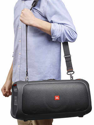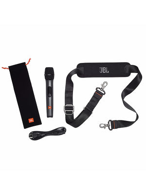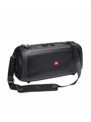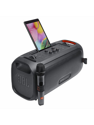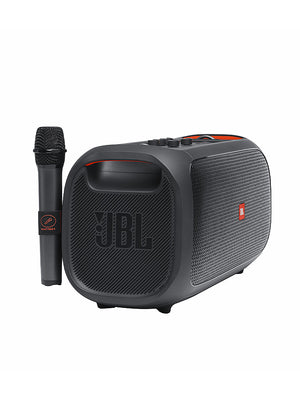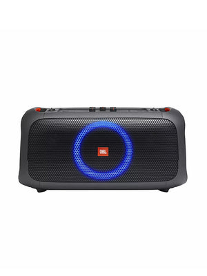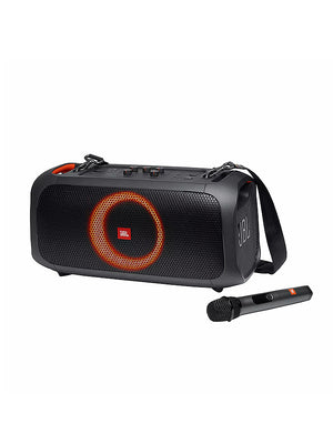 From beach parties to festivals, the JBL PartyBox On-The-Go lets you see, hear and feel the beat. Turn it up loud with 100 watts of powerful JBL Pro Sound, synched to a dazzling light show. Access your favorite tunes with Bluetooth, USB, AUX and TWS (True Wireless Stereo) connectivity, grab a friend and sing your hearts out with the JBL wireless mics, or use the instrument input to play along. With a bottle opener, padded shoulder strap, rechargeable battery and IPX4 splash-proof protection, the JBL PartyBox On-The-Go has everything you need to get the party started—and take it with you.