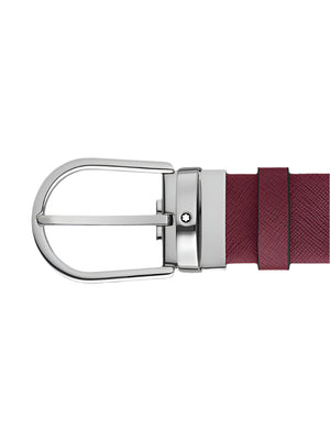 This elegant 35mm tubular belt, crafted in rich cassis Saffiano-embossed leather, features a horseshoe pin buckle with a shiny palladium finish, adding a sophisticated touch to both formal and casual outfits.