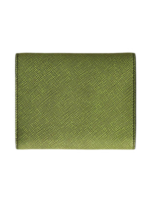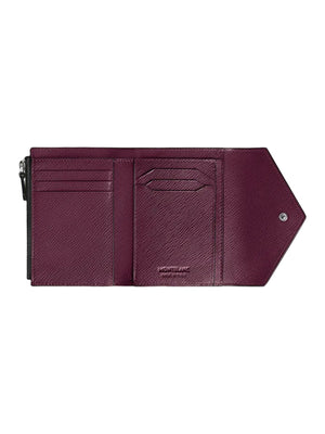 Experience streamlined elegance with this tri-fold mini wallet that comfortably fits into your pocket. Crafted in bold Saffiano-printed leather, the exterior is adorned with an elegant multilime. Opening up like an envelope, it reveals a cassis leather interior with slots to accommodate up to six credit cards, a zipped pocket for coins and keys, a banknote compartment, and two extra pockets for seamless organisation.