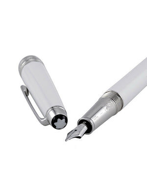 Fountain Pen 145 M. Lacquered in a pure white. Metal forepart and fittings platinum plated. Engraved with the panorama of the Mont Blanc massif. Montblanc emblem made of natural snow cristal. Rhodium plated 18 K gold nib.