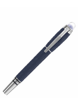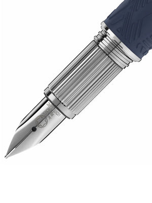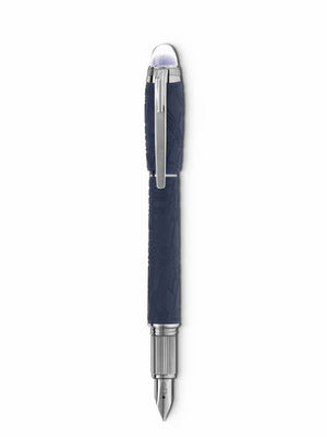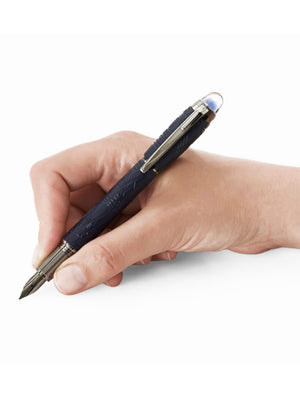 Starwalker Space Blue looks beyond planet earth and turns towards the stars and the galaxy. Utterly masculine and futuristic, this new Star Walker collection brings a new look for resin cap and barrel, with a design that recalls the intricate structures of the Widmanstätten Pattern, one of nature's most hypnotic creations. All metal parts are coated in dark ruthenium, accompanied by a deep space blue tone for the matte precious resin, recalling the hues of a starry sky. Also the sub dome on the cap top, over which the Montblanc emblem floats, comes in a deep space blue colour. The fountain pen is hand-crafted with a rhutenium-coated Au585 gold nib.