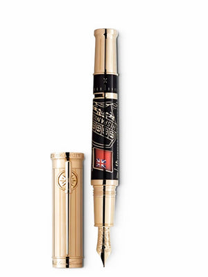 Robert Louis Stevenson, born in Edinburgh, Scotland, in 1850, had two great desires: for freedom and for immersing himself in other worlds. He composed essays and travel accounts as well as his legendary adventure stories populated with striking characters whose names send a shiver down the spines of readers around the world: Long John Silver, Captain Flint, Jekyll and Hyde. The Montblanc Writers Edition Homage to Robert Louis Stevenson is dedicated to this imaginative storyteller. The novel “Treasure Island” inspired many design details of the edition. The overall shape of the writing instrument and the rings on the cone combine to create an impression of a historic, extendable spyglass. Retelling the story of the Treasure Island , this edition shows the famous Hispaniola on the barrel, intromitted in precious Black lacquer. Embarking on a journey, the Hispaniola waves a British Ensign held behind a small window. Following the storyline of mutiny by pirates, the flag can be turned by a little knob to reveal a pirate's flag. Vertical lines that bring to mind the planks of the schooner “Hispaniola” and a traditional sea chest adorn the signature gold-coated cap. Behind the signature gold-coated clip, the lines converge in a compass rose, while the clip imitates the shape of a belaying pin, to which the lines of a ship’s rigging would be secured. The cap top is crowned by the Montblanc emblem in Mother-of-Pearl. The cap ring is adorned with an engraving of Stevenson’s signature. As a reference to Robert Louis Stevenson’s passion for seafaring and his re-settlement in the South Seas, the handcrafted solid Au 750 gold nib is engraved with clouds, seagulls and the title given by the Samoans to the great writer and world traveler, “Tusitala”. With signature gold and/or signature gold-coating, Montblanc describes the enlightened shade of yellow gold which has become an appreciated tone for the Maison’s Writing Instruments.