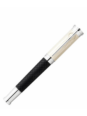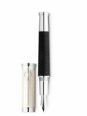 Robert Louis Stevenson, born in Edinburgh, Scotland, in 1850, had two great desires: for freedom and for immersing himself in other worlds. He composed essays and travel accounts as well as his legendary adventure stories populated with striking characters whose names send a shiver down the spines of readers around the world: Long John Silver, Captain Flint, Jekyll and Hyde. The Montblanc Writers Edition Homage to Robert Louis Stevenson is dedicated to this imaginative storyteller. The novel “Treasure Island” inspired many design details of the edition. The overall shape of the writing instrument and the rings on the cone combine to create an impression of a historic, extendable spyglass. The black precious resin barrel is decorated with engraved crosses, including a larger “X” like the one marking the location of the treasure on a map. Vertical lines that bring to mind the planks of the schooner “Hispaniola” and a traditional sea chest adorn the cap of the Writers Edition. Behind the platinum-coated clip, the lines converge in a compass rose, while the clip imitates the shape of a belaying pin, to which the lines of a ship’s rigging would be secured. The cap top is crowned by the Montblanc emblem emblazoned with the pirate’s symbol, a skull and crossbones, elevated at its center. The cap ring is adorned with an engraving of Stevenson’s signature alongside the publication date of his first work “The Pentland Rising”, 1866. The dates, 1850-1894, are engraved on the cap to commemorate Robert Louis Stevenson’s life. As a reference to Robert Louis Stevenson’s passion for seafaring and his re-settlement in the South Seas, the handcrafted solid Au 750 gold rhodium-coated nib is engraved with fine waves and the title given by the Samoans to the great writer and world traveler, “Tusitala”.