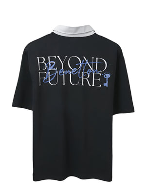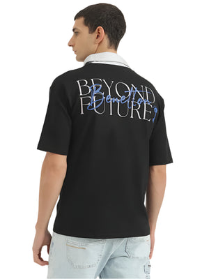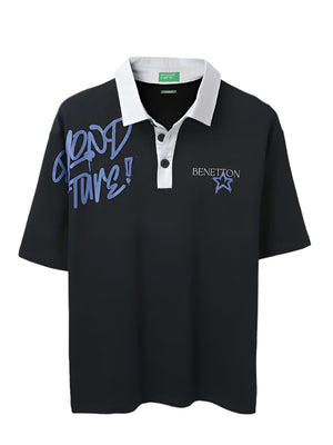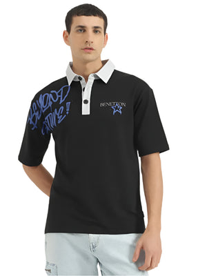 Effortlessly stylish, this black oversized polo features a bold printed pattern, short sleeves, and a button closure. Crafted from a comfortable cotton blend, it offers a relaxed fit for all-day wear.