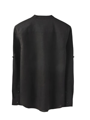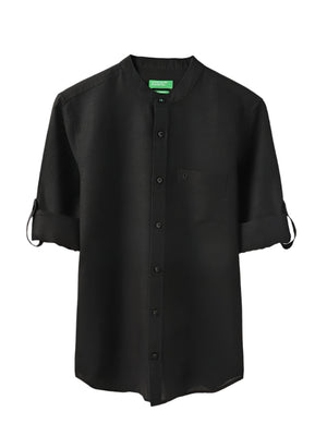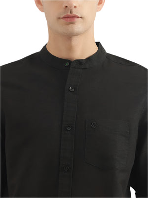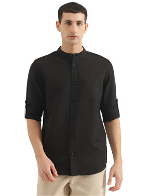 Effortlessly stylish, this black linen blend shirt with a mandarin collar and button closure exudes sophistication. The regular fit and full sleeves offer comfort and a timeless appeal.