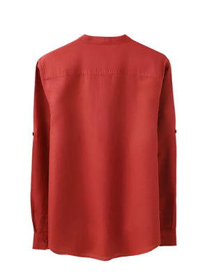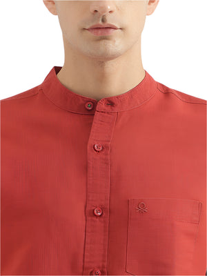 Effortlessly stylish, this crimson linen blend shirt boasts a classic mandarin collar, full sleeves, and a comfortable regular fit. The solid red hue and button closure exude timeless sophistication.