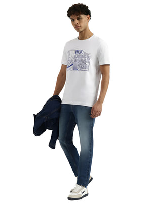 Classic blue skinny jeans for men, featuring a washed pattern for a vintage look. Mid-rise fit with button and zip closure. Crafted from pure cotton for comfort and durability.