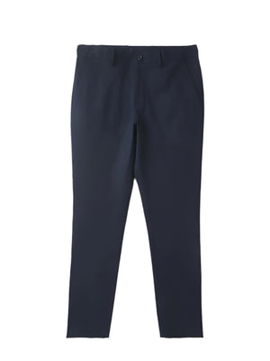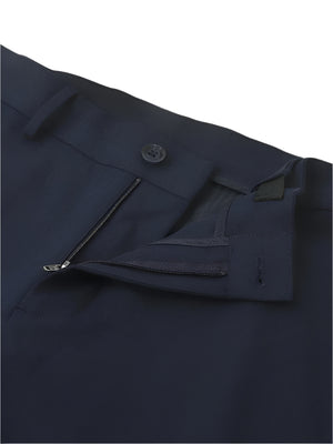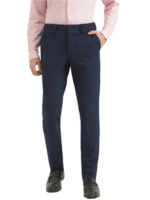 Elevate your style with these sleek, slim-fit trousers. Crafted from a comfortable polyester viscose blend, they feature a mid rise, button closure, and a timeless solid blue hue. Perfect for both casual and smart casual occasions.